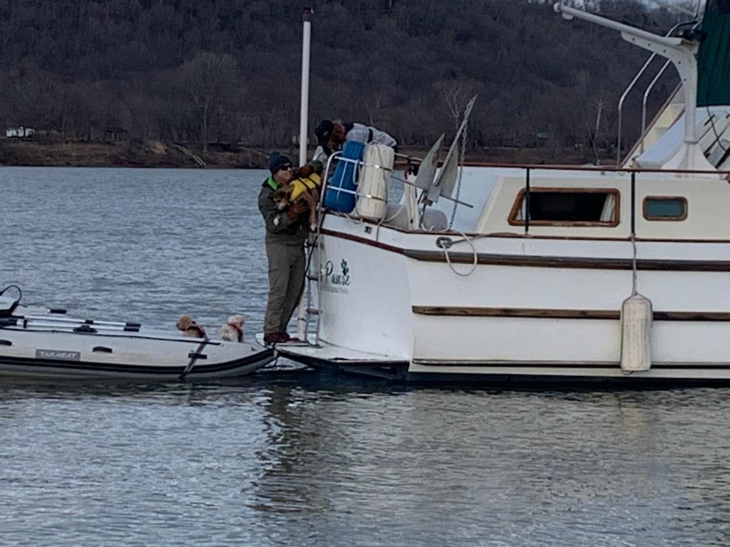 We anchored at Carrollton, KY and brought Jan and the pups to shore on the dinghy. It was a little glitchy but no one took a swim.